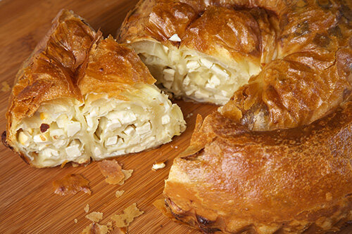 Ингредиенты: На 320 г муки-3 яйца,2 ст.ложки растительного масла (в тесто),80 г сливочного масла,500 г брынзы Приготовление: Приготовить пресное тесто,раскатать в большой пласт,и смазать сливочным маслом.На края пласта и по всей середине распределить брынзу и скрутить пласт в виде рулета.Перед выпечкой смазать яйцом.Выпекать в духовке при температуре 200-220 градусов. Перед подачей на стол порезать на порции по 100-200 г и полить растопленным сливочным маслом. Приятного аппетита!