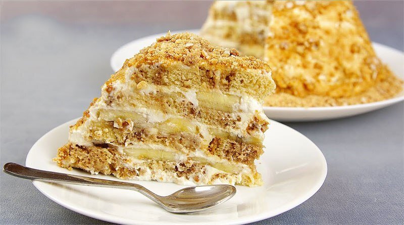 Торт самый простой и для приготовления не требуется что-либо выпекать. Обходимся только ножом и ложкой. Никто, ни за что не догадается, какой состав. Готовлю этот торт, когда времени на выпечку практически нет. Получается очень бюджетная сладость. После хорошей пропитки, по вкусу напоминает банановый бисквит Состав · 500 грамм сметаны 20 процентов жирности · 4 штуку спелых бананов · 0,5 кг пряников без начинки (свежие) Десерт из трех ингредиентов. Приготовление: Пряники и бананы нужно нарезать (я нарезала дольками). Стены и дно формы стелить пленкой (пленка пищевая). Начинаем класть нарезанные ингредиенты в форму. Количество слоев у нас будет три (слои повторяются три раза). Сначала на дно идет слой пряников, заливаем сметаной, затем бананы. Так прослойки повторяем еще два раза. Последний слой еще раз мажем сметаной. После, завернуть торт в пленку пищевую и положить в холодильник, для пропитки. Время пропитки 5-7 часов. Далее, пропитанный торт класть на блюдце. Сняв пленку и освободи
