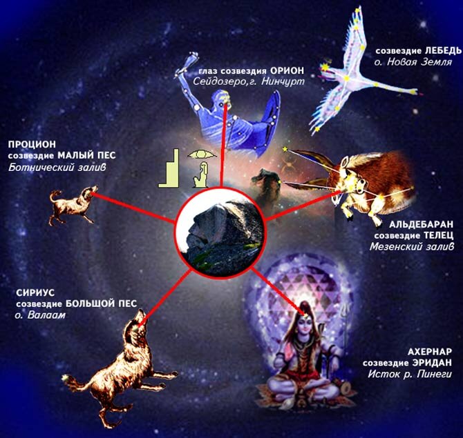 Когда места древних гиперборейских святилищ, найденных в районах Кольского полуострова, Белого моря и Северо-Запада европейской части России (Кандалакша, Сейдозеро, Чальмны-Варрэ, Поной, Кузова, Соловки, Анзер, Воттоваара, Кожозеро), были учёными из МКУ соединены условными линиями, на географической карте проявилось... созвездие Ориона-охотника :