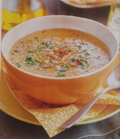 Здесь будет описан рецепт необыкновенно вкусного блюда. На 4 персоны. Калории -150 Необходимо взять: Грибы замороженные-300 гр, Чеснок-1 зубчик, Лук-1,Картофель-4,Куркума-1 ч.л.,Петрушка-1 пучок, Масло растительное,соль,перец Приготовление: 1/3 грибов обжарьте на растительном масле -чтобы украсить блюдо. Для начала почистить, порезать картофель,перемешать с куркумой. В кастрюлю добавить 3 ст.л. масла , обжарить нарезанный лук ,чеснок,затем добавить размороженные грибы , обжарить,залить 700 мл воды,добавить картофель и варить до готовности, добавив соль ,перец по вкусу. Готовый суп перелить в блендер , сделать пюре,разлить по тарелкам,сверху украсив грибами и мелко порезанной петрушкой. Приятного аппетита!
