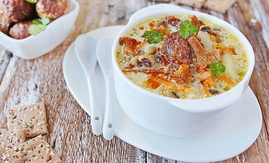 Предлагаю также запечь к первому блюду в духовке фрикадельки и опустить их в тарелку с супом, непосредственно перед подачей. Вы удивитесь, насколько это получится вкусно! Использовать грибы лисички в домашнем рецепте не принципиально, здесь могут быть любые лесные грибы или шампиньоны. А вот фасоль выбирайте не разваристую, чтобы она сохранила форму и суп остался прозрачным. Также можно использовать консервированную фасоль, которую кидать в суп нужно в конце приготовления. Вообще такой суп можно назвать также сборным, потому что в нём сочетаются много продуктов, но при этом они хорошо гармонируют между собой. Предупреждаю, готовьте сразу большую кастрюлю горячего супа, так как у вас обязательно попросят добавки! Пошаговое приготовление грибного супа с фрикадельками и фасолью с фото, уверена, разыграл ваш аппетит, поэтому скорей пробуйте его сварить, и делитесь своими впечатлениями. Ингредиенты для приготовления этого чудесного супа: