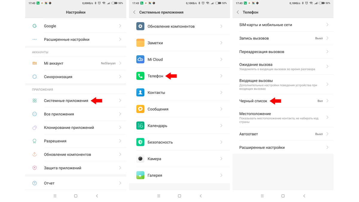 Для перехода к редактированию "Черного списка", заходим в "Настройки" - "Системные приложения" - "Телефон" - "Черный список".