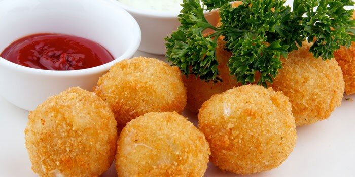 Сырные шарики получаются очень сытными, подавать можно как в холодном так и в теплом виде, на подносе и украсив свежей зеленью. При желании, блюдо можно дополнить соусом – сливочным или томатным.