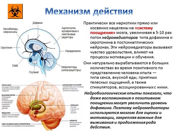 Казалось бы что плохого: много радости, много счастья! Однако при употреблении наркотиков центр удовольствия чрезмерно реагирует на стимуляцию и преодолевает "стоп-систему" в центре принятия решений.