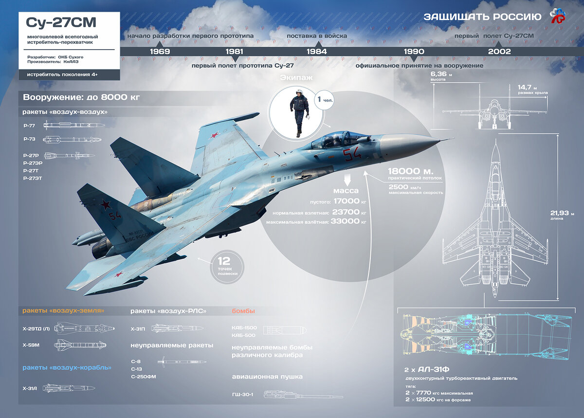В настоящее время Воздушно-космические силы эксплуатируют около пятидесяти модернизированных истребителей Су-27СМ. Эта машина получила обновленную систему управления вооружением истребителя, в кабине появились три многофункциональных индикатора, а пилоты Су-27СМ используют нашлемную систему целеуказания. Боевые и технические характеристики истребителя — в инфографике «Защищать Россию». Многоцелевой всепогодный истребитель Су-27 стал ответом советских авиастроителей на появление в США первого в мире истребителя четвертого поколения F-15 Eagle. Flanker, как его окрестили в НАТО, был первым советским серийным самолетом, оснащенным электро-дистанционной системой управления. Она обладает бОльшим быстродействием и точностью и позволяет применять сложные алгоритмы управления. На этом истребителе впервые в мире была выполнена фигура пилотажа «кобра», или динамическое торможение. В мире этот маневр широко известен как «кобра Пугачева» после того, как летчик-испытатель Виктор Пугачев выполни
