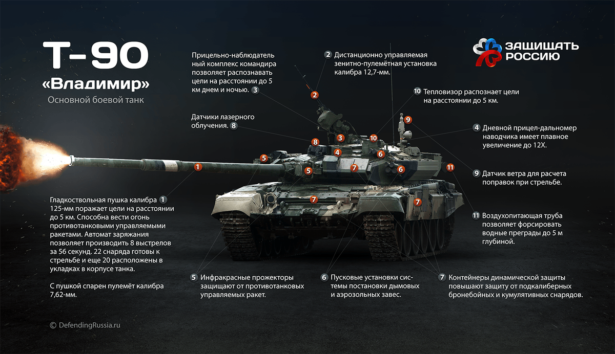 Танк Т-90 — хорошо узнаваемый символ российского оружия. Его прозвали «летающий танк», за динамичность и отличную подвеску, выдерживающую резкие прыжки на пересеченной местности. Второе название — «Владимир» — танк получил в память о своем главном конструкторе, Владимире Поткине. Мощная, отлично защищенная и вместе с тем неприхотливая машина, наследник хорошо известного в мире Т-72. Пользуется спросом за рубежом: индийцы намерены к 2020 году иметь 2000 таких танков (половину уже собрали), а Алжир заказал около 300 машин, получив уже две трети. Есть и другие заказчики. Сейчас «Уралвагонзавод» выкатил принципиально новый образец — танк Т-90АМ «Прорыв» (в экспортной версии Т-90СМ). Танк получил новую башню с более мощным орудием и современной системой управления огнем.