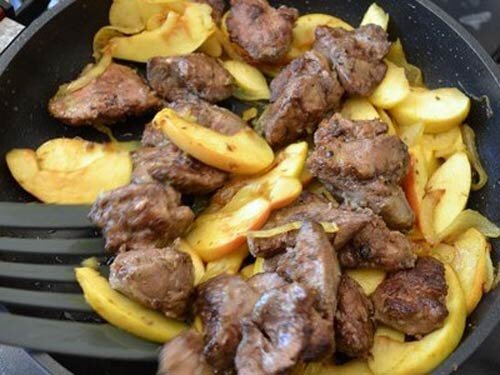 Из печени можно приготовить разнообразные блюда. Можно варить, делать пирожки, обжаривать, делать с соусом. Немного фантазии и вуаля!:) Ингридиенты: печенка: говяжью либо куриную - 500 гр., зелёное яблочко - 2 шт., 1 луковица, специи по вкусу (смесь перцев и соли) - 0,5 ч.л. Берём печень любую, говяжью или куриную (я беру говяжью) 0,5 кг. Если семья большая, то 1 кг и соответственно продукты увеличиваем. Заливаем горячей водой 30 секунд, если не снимается плёнка. Затем плёнку снимаем. Режем кусками примерно 2 на 3 см., отбиваем печёнку, чтобы была мягче. Теперь каждый кусок обваливаем в муке. Жарим в сковороде в масле 2-3 минуты. Добавляем специи и мешаем. Печёнка получится нежной и вкусной. Перекладываем в тарелочку. Зелёные яблочки очищаем от кожуры, режем ломтями примерно 3 см. Вынуть всю печёнку и поджарить на этом же масле яблочки. Так яблоки будут пропитаны печёночным запахом Собирать печёнку до конца, чтобы не оставалось никаких крошек. Затем жарить яблоки на средне