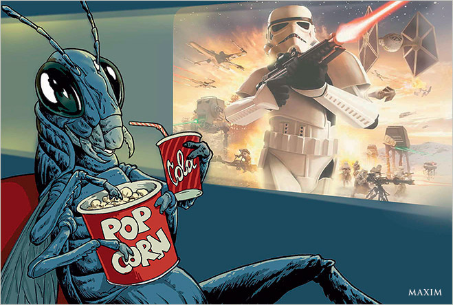 Энтомологам Клэр Ринд и Питеру Симмонсу из университета Ньюкасла сильно повезло. Вместо того чтобы подсчитывать тараканьи конечности и нарезать божьих коровок, эти ребята провели несколько месяцев за просмотром излюбленных мест из фильма «Звездные войны». Правда, во время сеансов ученым приходилось периодически отвлекаться на саранчу, которая тоже смотрела фильм. Дело в том, что Ринд с Симмонсом затеяли все это под предлогом исследования реакции мозга насекомого на творчество Джорджа Лукаса. Подразумевалось, что летящие на саранчу космические корабли вызовут у насекомого желание от них шарахаться. Изучив это желание, энтомологи планировали создать робота, который, подобно саранче, очень быстро реагировал бы на движущиеся объекты. Робота можно было бы использовать для автонавигации автомобилей… Представляешь, как некоторым приходится заморачиваться, чтобы смотреть любимые фильмы на работе?