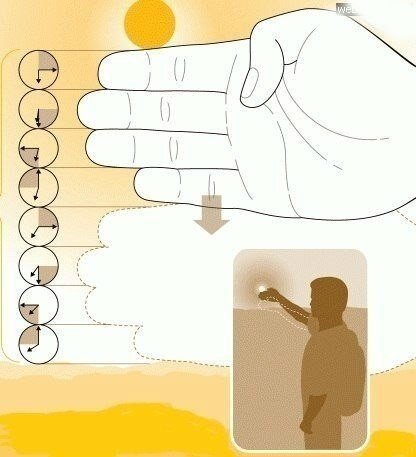 Итак, всё что необходимо сделать — вытянуть руку так, чтобы солнце как бы лежало на вашем указательном пальце. Теперь считаем количество пальцев до горизонта. Если у вас более-менее стандартная толщина пальцев, то каждый палец будет равен приблизительно 15 минутам до заката.