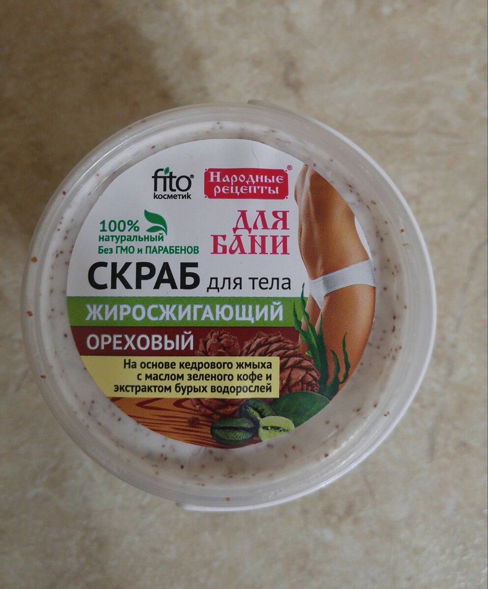 Я уже приобретала в Fix Price продукцию фирмы fito косметик по цене 55 рублей, которая мне подошла и понравилась. В этот раз я взяла на пробу жиросжигающий скраб, так как для меня сейчас это очень актуальный продукт. Я активно готовлюсь к лету с помощью спорта и диеты и для лучшего эффекта такой скраб мне не помешает. Как обычно упаковка - это очень симпатичная баночка с ручкой, на которой указано, что внутри 100% натуральный жиросжигающий ореховый скраб для тела. Скраб помимо жиросжигающего эффекта должен хорошо очищать и тонизировать кожу. На баночке указано, что он для бани, но я думаю, что и в обычной ванне он будет работать, просто в бане такие средства более эффективны. Объем баночки 155 мл, это не очень много для скраба, поэтому думаю его хватит не надолго. Но с другой стороны он не успеет надоесть и можно будет быстрее купить на пробу другой скраб из этой серии. Конечно же я сразу открыла чудо-баночку и попробовала скраб. Запах ооочень приятный, нежный, с ореховыми нотками