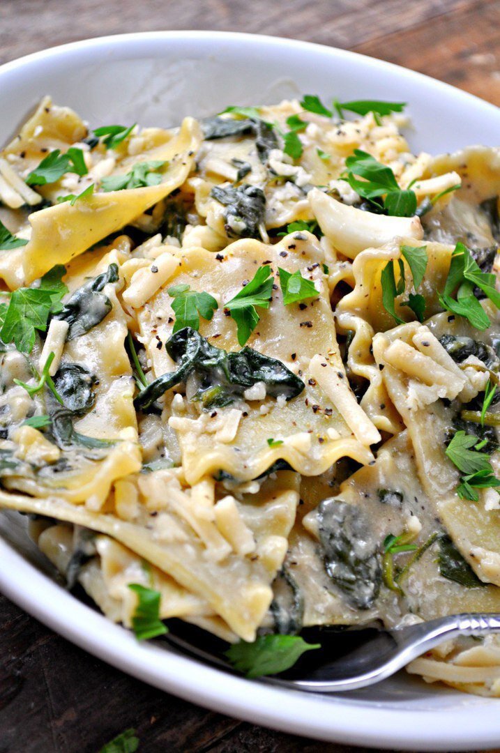 6. Добавить к соусу шпинат и перемешать.