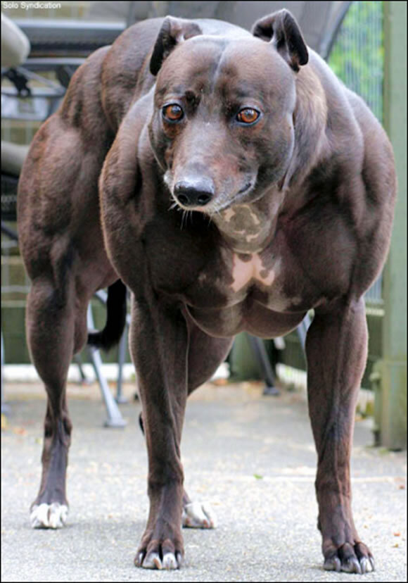 Это не фотошоп, фото реальное - уникальная английская борзая (уиппет) по имени Венди. Ярко выраженная мышечная масса с минимальным содержанием жира принесли ей и ее хозяевам всемирную известность. В сети ее прозвали собака-бодибилдер. В чем же тут дело? Оказывается, дело в мутации гена миостатина. Миостатин - попросту это белок, который сдерживает рост мышц, чтобы они не становились слишком большими. Мутации, которые снижают производство миостатина, приводят к перерождению или обновлению мышечных тканей. На первый взгляд можно подумать, что это питбуль или мастиф с маленькой головой, или слишком много тренируется. Но это собака, у которой просто вдвое больше мышечной массы, чем у собак ее породы. Уиппеты отличаются тоненькими левреточными ножками, а здесь такой массив! Большая Венди - именно так ее зовут - не нуждается в постоянных физических нагрузках или усиленном питании, ее мускулатура обусловлена исключительно мутациями гена миостатина, но ее остальные органы - голова,