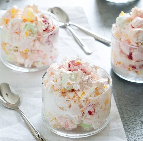 Салаты - блюдо, которое украсит любой стол, именно поэтому тема вкусные салаты, рецепты салатов так популярна. Мы предлагаем хорошую подборку рецептов салатов, чтобы вы могли всегда найти новый рецепт вкусного блюда и покорить своих близких и гостей новым оригинальным вкусом. 1. Салат «Амброзия» Ингредиенты: 200 гр. замороженных взбитых сливок 1/2 чашки ванильного йогурта 2 ст. л. кокосовой стружки 100 гр. нарезанных мандаринов 100 гр. нарезанных ананасов 1 чашка сухофруктов 1 1/2 чашки зефира (мелко нарезать) ПРИГОТОВЛЕНИЕ: 1.В большой миске взбейте йогурт и сливки. 2.Добавьте остальные ингредиенты. 3.Перед подачей охладите. ПРИЯТНОГО АППЕТИТА ! 2. Салат с мандаринами. Ингредиенты: 1/2 ст. мелко нарезанного зеленого лука 2 мандарина, очистить и нарезать 1 яблоко, нарезанное кубиками 1 чашка сыра типа фета 1 чашка сухариков 1/2 чашки мелко нарезанных орехов 2-3 листика салата, нарезать 1 авокадо, нарезанный кубиками 2 ст. л. оливкового масла Для соуса: 1/4 чашки оливкового масла 2 ст.