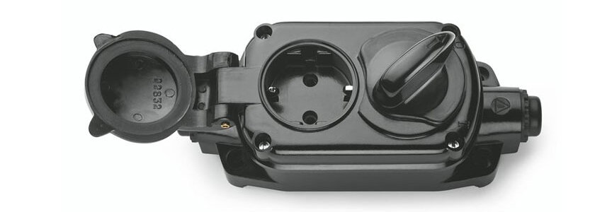 На фото (внизу, не в галоше) — двойная уличная розетка. Видны сальники защиты ввода кабеля. Важно понимать: максимальная защита, степень которой и указана в спецификации, обеспечивается только при плотно закрытой крышке. То есть розетка со включенной в неё вилкой — это уже гораздо более уязвимый агрегат.