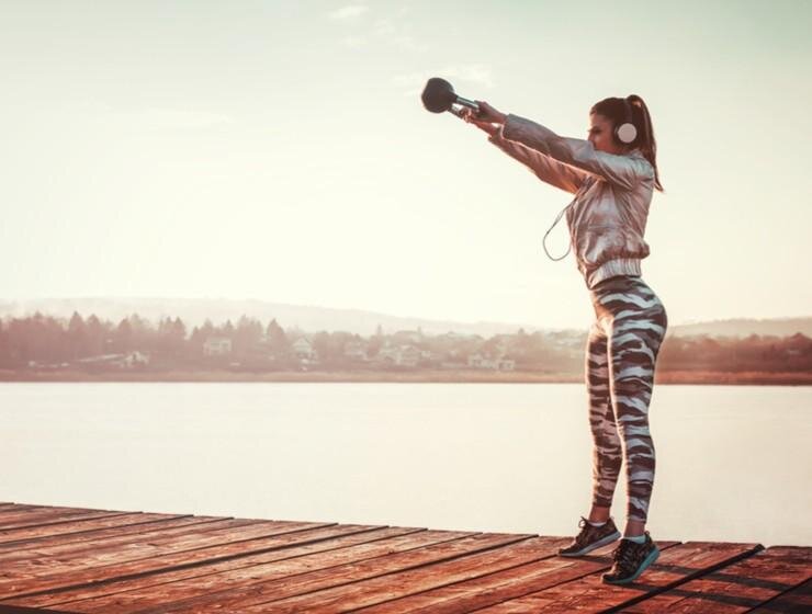 Подъем бедер Мышцы: ягодицы, задняя часть бедер, нижняя часть спины. Делать: 12 повторений для обеих ног. (a) Лягте коврик. Положите руки по бокам. Согните правую ногу в колене, положите стопу ровно на землю. Держите левую ногу вертикально на коврике. (b) Затяните ягодицы и поднимите бедра, пока ваше тело от колен до плеч не образует прямой линии. Вернитесь к началу. Сделайте 12 повторений. Выпады с гирями Мышцы: бедра, ягодицы, тело, плечи, руки, предплечья Делать: 15 повторений (a) Возьмите гири обеими руками и станьте легким шагом, ноги на ширине плеч. Отодвиньте свои бедра назад и осторожно согните колени, чтобы наклониться вперед и переместить гири на уровень бедр. (b) Двигайте ваши ноги динамическим движением и выдвигайте бедра вперед. Продолжить. Не тяните гантели руками! Вход в скамью Мышцы: бедра, ягодицы, тело Делать: 10 повторений на обеих ногах (a) Подходите прямо к скамейке. Положите на него правую ногу. Убедитесь, что торс в вертикальном положении. (b) Надавите на скам
