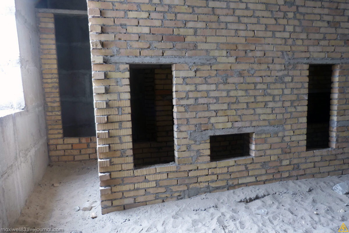 Продолжение. Начало здесь. В одной из комнат увидели странные перегородки с отверстиями. Интересно, зачем они? Вот так они выглядят внутри. В здании фоткать нечего. Поэтому дырка в потолке, как интересность. Из необычного только высота потолков. Выходим наружу. Тем более, лестницу так и не нашли. Крайний корпус ещё с одной стороны. Архитектурная фишка — окантовка стен из кирпича (или как оно называется). Ещё одна фишка — полукруглые балконы над входами в торцах зданий. Ну а нам время возвращаться. Поэтому на прощание фотографирую тот самый крайний корпус. С холма хорошо видно котельню. Значит и с котельни хорошо видно холм. Возвращаться мимо неё не хотелось. Поэтому решили обойти с другой стороны. А вот уже видно церковь и туалет для строителей. Изнутри территория комплекса кажется меньшей, чем снаружи. Странное ощущение пространства. В центре периметра появляются бетонный забор и заброшенная линия электропередач. Возле недостроя обустроили коттеджный городок доля судей. А между за