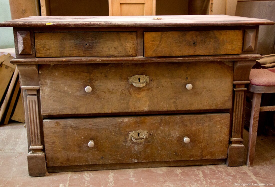 Предметы мебели из сосны, даже покрытые качественным лаком, с течением времени теряют первозданный вид. Возвращения яркого и сияющего вида можно добиться повторным использованием лака или полной перекраской. Также, к примеру, можно прибегнуть к старинным техникам реставрации старой мебели для придания убранству свежего звучания и украшения притягивающими взгляд деталями. Методика «декупаж» - поможет каждому. На наружность соснового шкафа, комода или высокого изголовья кровати можно нанести тканевые орнаменты определённого оттенка, фигурки из бумаги, открытки прошлых лет, плетение, оригинальные рисунки или фактуры. Для нанесения нужно: клей, ножницы, закрепляющий лак, валик и губка для снятия лишнего клея и закрепляющего лака. По итогу этой процедуры изделие из сосны станет уникальным. Методика декорирования «кракелюр» даст возможность «накинуть» 10-15 лет любимому вами стеллажу, шкафу или столу. Определённый лак в сочетании с битумной патиной образуют на покрытии обрабатываемого п