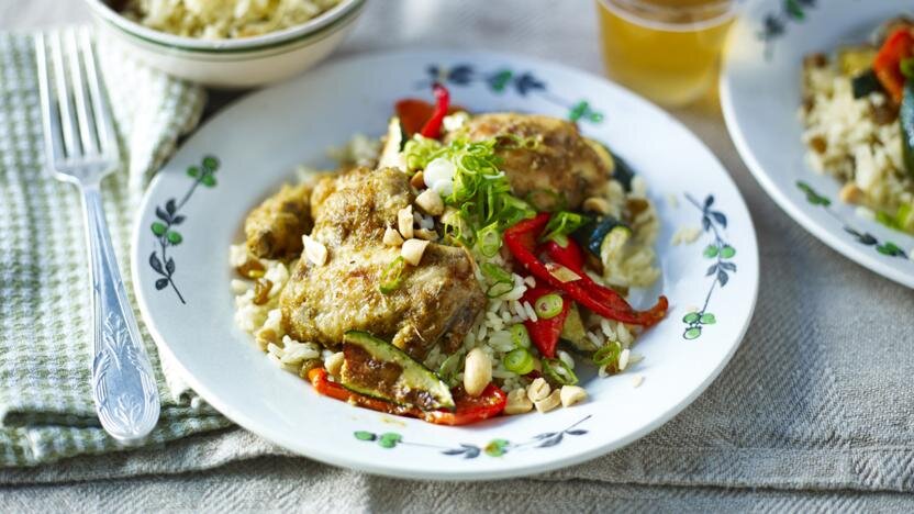 Этот рецепт создан так, что тушка готовится отдельно от остальных частей жареного цыпленка. Это делает запас для приготовления ароматного риса. Состав продукта · 1 небольшая целая курица · 2 столовые ложки свеженатертого имбиря · 1 ст. л. молотого тмина · 30мл/2 ст. л. растительного масла · ½ Ст. л. сушеного тимьяна (если используете свежий то 1 ст. л.) · соль и черный перец · 1 цуккини, нарезать ломтиками по диагонали · 1 красный перец, очищенный от семян и нарезанный на дольки · 200г длиннозерного риса · 1 корица, палочка · 1 лавровый лист · 3 кардамон, стручки · 125г зеленый изюм · 1 лимон, цедра и сок · 1 лайм, цедра и сок Приправа · 100г орехов кешью, очищенных, слегка поджаренных и порезанных · 1 ст. л. мелко нарезанный зеленый лук · 1 столовая ложка нарезанного свежего кориандра (по желанию) Способ приготовления 1. Разогрейте духовку до 200C. 2. Разделайте курицу, удаляя грудки, ноги и крылья. Поместите оставшуюся тушку в большую кастрюлю и залейте водой с запасом. Довести д
