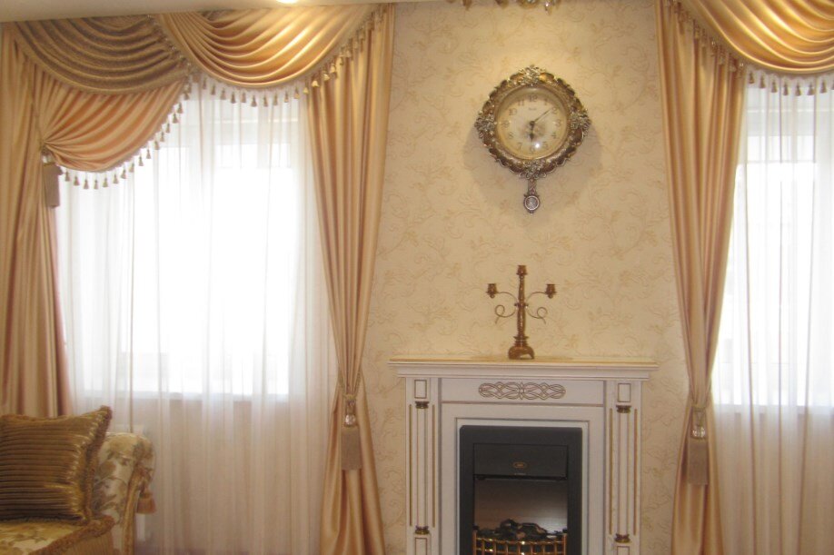 Классические Считаются самыми популярными. Это применение довольно плотных двойных штор и легких гардин, красиво и свободно нисподающих. Иногда, они дополняются в верху окна ламбрекенами.