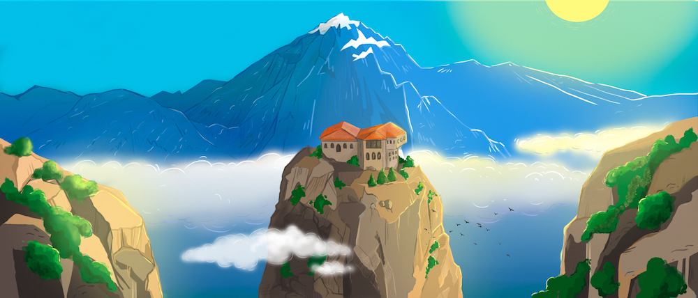 В первый вечер нам удалось попасть в самый большой монастырь — Великий Метеор, или Мегало Метеора. Расположен он на самой высокой скале — 613 метров над уровнем моря. Подниматься придется по крутой и довольно длинной лестнице, вырубленной прямо в скале.