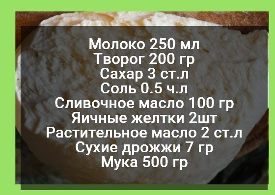 Здравствуйте Мои Хорошие!!! Советую Вам интересный рецепт дрожжевого теста с творогом! Идеально подходит для булочек, вкусного хлеба, просто для пышек, там дальше можете экспериментировать!!! Тесто очень хорошо поднимается в течении часа, и сразу можете начинать готовить! Ингредиенты: Способ приготовления: 1. Дрожжи высыплем в миску и нальем подогретой очищенной воды. 2. Насыплем ложку сахар, и одну столовую ложку муки, дадим постоять, чтобы поднялось. 3. Теперь подогреваем молоко и выльем его в миску, к нему добавим остатки сахара, масло, творога,соли и перемешаем. 4. Теперь отделим от яйца желток и добавим в тесто, выльем поднявшиеся дрожжи. 5. Насыплем просеянной муки и замешиваем тесто, даем ему подняться в течении часа и можете выпекать! Приятного Аппетита!!! Угощайте друзей, Родных и Близких!!! Подписывайтесь, Не забываем ставить класс))) Заходите ко мне по чаще!!!