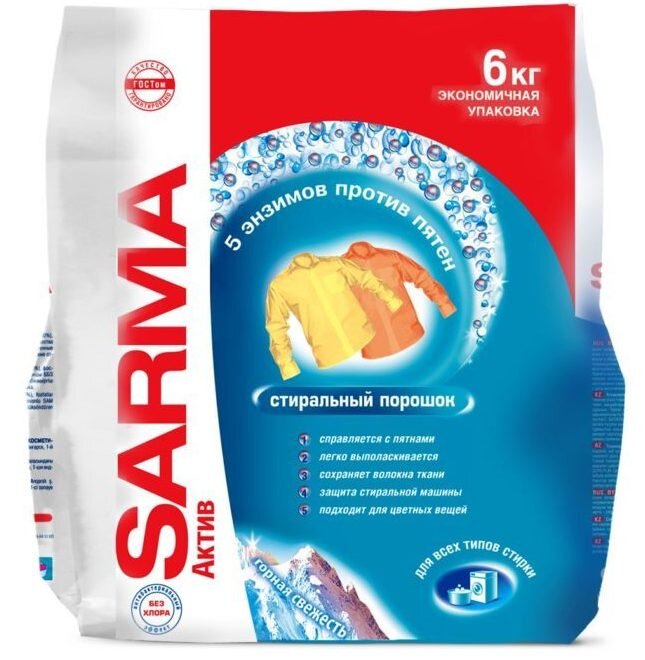 Если недорого и экономно… Именно к этой категории следует отнести следующих представителей: 1. Sarma Active – для белой и цветной одежды из натуральных и синтетических волокон, а также для всех типов стирки и разных проблемных зон. Исключение – шелковые и шерстяные изделия. Отсутствие хлора свидетельствует о бережном отношении к тканям, а добавление комплекса энзимов обладает антибактериальным эффектом, уничтожающим пылевых клещей; 2. Tide Белые облака – исключительно для возвращения белоснежного эффекта вашим одеяниям. Следите за процессом, поскольку возможно появление голубизны; 3. Losk 9 Total system, основная черта которого приятный аромат и универсальность для синтетических и смесовых изделий, которые хорошо очищаются и при значительном показателе жесткости воды. Ввиду наличия агрессивных составляющих и не слишком приятного резкого запаха рекомендовано интенсивное и тщательное выполаскивание. Более эффективные и популярные В этом списке вы увидите давно известные марки, которые