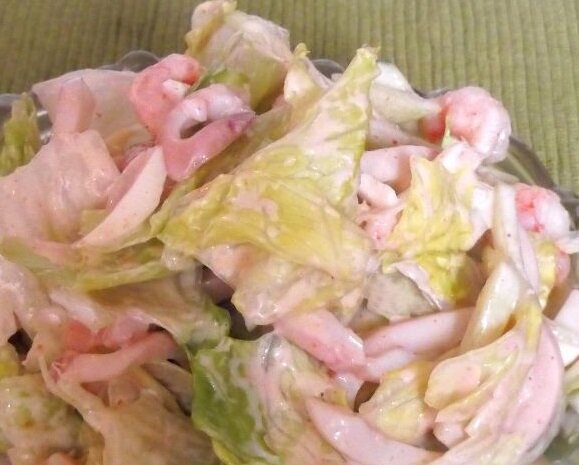 Кальмары отварить, варить их нужно в кипящей воде в течении 2-3 минут, после чего снять с них пленку.Креветки обдать кипятком, для того чтобы снять их разморозить, после очистить. Кальмары нарезать соломкой. Яйца отварить и нарезать полосочками. Огурцы нарезать брусочками.Салат порезать не небольшие кусочки. Теперь делаем заправку для салата, смешиваем в глубокой мисочке майонез, кетчуп и коньяк.Подготавливаем глубокую миску для салата, перемешиваем все ингредиенты и заправляем салат нашей пикантной заправкой.