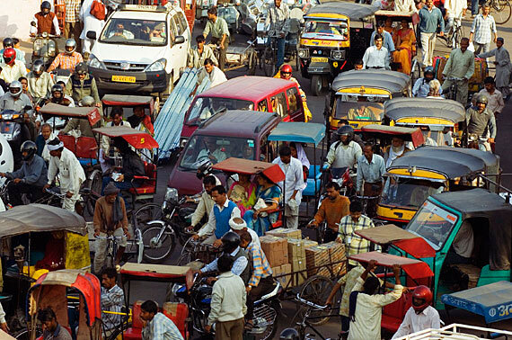 Дорожное движение в Индии шокирует всех первоприбывших в эту страну. Неважно, какой у вас водительский стаж: будь вы хоть Шумахер, добровольно влиться в эту хаотичную гудящую толпу отважится не каждый. А на поверку оказывается все не так уж страшно. Говорят, в Индии нет правил дорожного движения. А они есть – целых тридцать, но их никто не соблюдает. Знаков и светофоров почти нигде нет, дорожной разметки тоже, нет и гаишников в нашем понимании (в Индии эту функцию выполняет обычная полиция). Самый популярный дорожный знак – «лежачий полицейский», появляющийся без предупреждения в самых неожиданных местах. Зато там много чего есть, чего у нас нет. Наряду с мотоциклами, автобусами, гружеными фурами вы встретите на дороге босоногих рикш, слонов, верблюдов и обязательно коров. Все это движется в разные стороны, под любыми углами и на разной скорости. В принципе, каждый едет, куда захочет. Поворотниками и другими сигнальными средствами здесь пользоваться не принято: о своих намерен