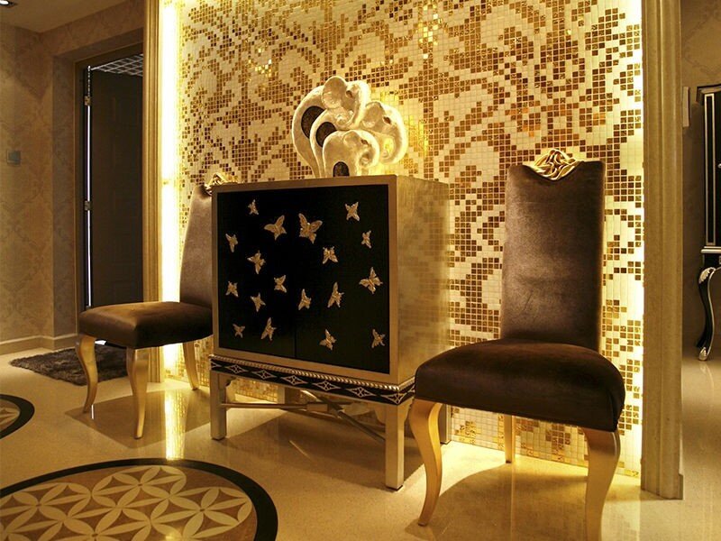 Из покон веков золото считалось признаком роскоши и богатства. И сегодня золотой цвет в интерьере облагораживает помещение и является признаком достатка. Этот цвет уместен при любом стиле и в любом дизайне. Можно его применять как элемент декора, например для зеркал или отделки "античного" столика или в виде статуэток.