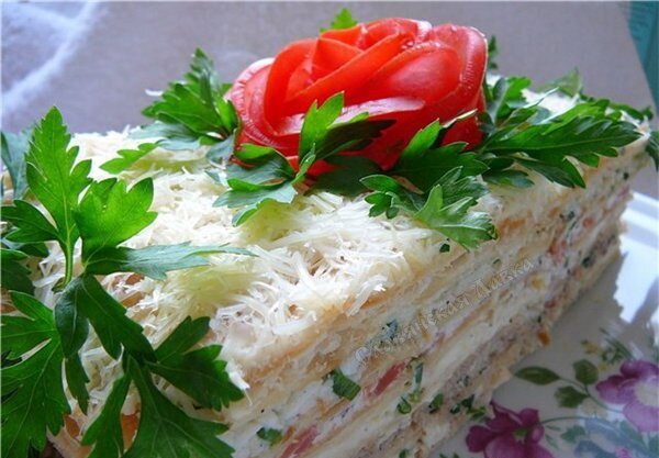 Современный праздничный стол не обходится без холодных закусок. В настоящее время существует множество рецептов разнообразных холодных закусок. Холодные закуски украшают праздничный стол. Сегодня я хочу вам предложить рецепт холодной закуски из слоеного теста с начинкой. Очень буду рада если этот рецепт вам пригодится. Ингредиенты: 250-300г. Бездрожжевого теста 200г. Сыра 150 г. Ветчины Консервированные ананасы 80г. Орехи грецкие 50г. Яйцо 1 шт. Сливки 40мл. 1 зубчик чеснока Способ приготовления: Оттаянное слоеное тесто раскатываем и режим порционно на прямоугольники размером 5см. на 5 см. тесто можно нарезать и другой формы это на ваше усмотрение. Выкладываем коржи на противень. Взбиваем яйцо и смазываем наши коржи. По всей поверхности коржи протыкаем вилкой, что бы они сохранили форму. Выпекаем наши коржи в духовке при температуре 190 градусов минут 15-20. Пока наше тесто выпекается делаем начинку. Трем сыр на крупной терке добавляем чеснок пропущенный через пресс и сливки. Все п