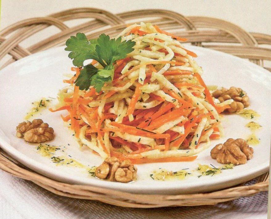 Ингредиенты: ( на 3-4 порции) Редька - 200 г Морковь - 1 шт Грецкие орехи - 40 г Лимон - 2 шт Чеснок - 1 зубчик Растительное масло - 2-3 ст. ложки Приготовление: Редьку и морковь очистить и нарезать соломкой. Орехи и чеснок растолочь в ступке. Натереть цедру лимона на мелкой терке. Из мякоти лимона отжать сок и полить им рекдьку с морковью. Орехи с чесноком и цедру смешать с растительным маслом. Посолить. Заправить салат смесью с растительным маслом и перемешать. При подаче оформить зеленью и грецким орехом. ПРИЯТНОГО АППЕТИТА!!! Ставьте "класс" и подписывайтесь на канал.