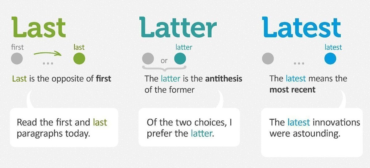«Кто последний в очереди? Ты слышал о последних новинках? Он съел последний кусок пирога». Как вы видите, во всех этих предложениях используется слово «последний», но в каждом оно несет немного разный смысл. 1. Last {lɑːst} - последний, крайний, прошлый. Мы используем слово last, когда говорим, что что-то не предполагает возможности повторения, то есть за ним не следует ничего другого. Что-то является последним в ряду или в количестве. She came last. - Она пришла последней. She went there last summer. - Она ездила туда прошлым летом. 2. Latest {ˈleɪtɪst} – самый последний, самый свежий, самый новый. Мы используем слово latest, когда что-то не предполагает завершения, а является самым новым, свежим. His car is the latest model. - Его машина последней модели. What is the latest news? - Какие последние новости?