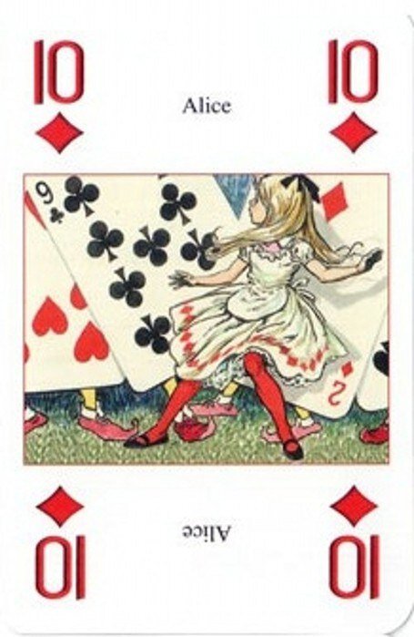 Иногда, видимо с подачи кэролловской Алисы, интересно взглянуть на людей, классифицировав их с позиции игральных карт. Вот идёт пиковая дама, а вот - червовая. Этот - явно король, а тот - валет (сейчас конкретные образы людей сразу встают перед глазами). Этот - Табаки-подпевала, явно шестёрка. Эта безликая пешка - явно двойка или тройка, и выше ей не прыгнуть, а эта боевая девица - десяточка. Тузы, почему-то, ассоциируются с богатеями (не предпринимателями - среди них чаще Короли, порой Валеты или даже десятки), а именно богатеи. Какие-то карикатурные новые русские... И кто тогда я? Какой масти, какого достоинства? Если бы мне было дано выбирать, я бы хотела быть джокером в рукаве судьбы. Понятно, что джокер не всегда заменяет карту большого номинала, а ровно ту, что нужна. Что тут ценно для меня - это непредсказуемость и... выпадение из системы иерархии. "В большинстве карточных игр джокер может выполнять роль любой другой карты, как и в простом ходу, так и при составлении комбина