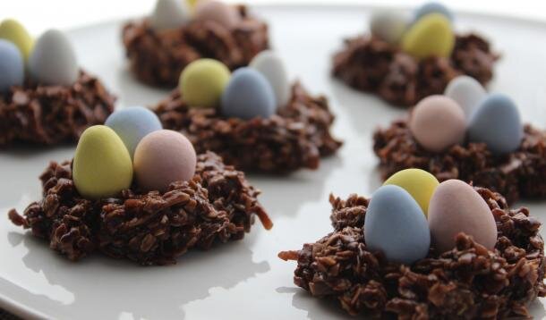 Я думаю, что эти печенья может быть одним из первых вещей, которые мне было позволено делать все самим. Потому что они требуют всего лишь несколько моментов. Есть плита приготовления пищи, но нет времени печь, Иногда они называются стогами сена, макаронами или курятинами, они - сладкое удовольствие. Вы можете приготовить всего за пять минут и положить их на тарелку у вас есть прекрасное украшение для вашего Пасхального стола. Ингредиенты 2 столовые ложки (60 мл) масла 1/3 стакана (90 мл) белого сахара 2 столовые ложки (60 мл) молока 5 чайных ложек (25 мл) какао-порошка 1/2 чайной ложки экстракта ванили 1/4 стакана (60 мл) несладкого кокосового ореха 3/4 стакана (180 мл) овсяных хлопьев (не быстрого приготовление) Инструкция приготовления 1. Выровняйте лист для выпечки с пергаментной бумагой и отложите. 2. В средней кастрюле на среднем огне расплавить масло. 3. Смешать сахар и какао-порошок; добавить к масла вместе с молоком. 4. Готовьте, помешивая, пока смесь доход