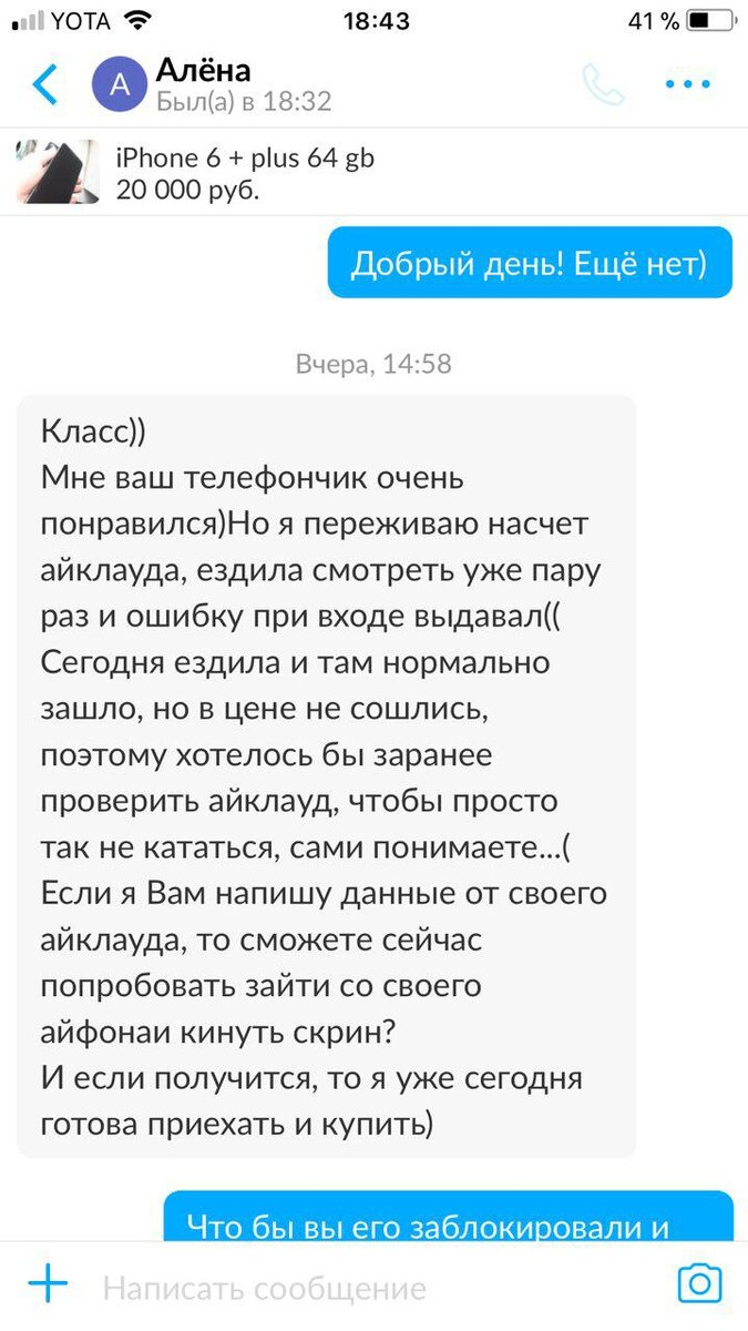Будьте аккуратны при продаже своего телефона! Уже больше тысячи заявлений в полицию по всей России, не поможет даже Сервисный центр! На днях, по ряду причин, решил продать свой телефон с надкусанным яблоком на задней панели. Буквально через 10 минут после подачи объявления на сайт, мне пришло сообщения от пользователя "Алена" с сообщением: "Приветик) Телефончик еще не продали?", я удивился - только подал объявление и уже кто-то пишет, цену я не занижал, продаю не спеша. Так же удивило, что в профиле девушки указан город Москва, а продавал я далеко не в столице. Ответил что еще нет, на что мне, через некоторое время пришел ответ, дословно: "Класс)) Мне ваш телефончик очень понравился) Но я переживаю насчет айклауда, ездила мотреть уже пару раз и ошибку при входе выдавал(( Сегодня ездила и там нормально зашло, но в цене не сошлись, поэтому хотелось бы заранее проверить айклауд, чтобы просто так не кататься, сами понимаете...( Если я Вам напишу данные от своего айклауда, то сможете сейчас