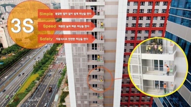 Система, работающая без электричества, может устанавливаться практически в любое многоэтажное здание. Общеизвестно, что пожарные лестницы не способны достать до верхних этажей многоэтажных зданий. Даже при оперативно организованном тушении возгорания люди в многоэтажках предоставлены сами себе и часто обречены. При этом общеподъездные балконы распространены в том числе и в российских многоэтажках. Посмотрите, как такие балконы задействуются корейской компанией Neri-Go. Встав на платформу 60х60 см, держась за поручень и нажав ногой на педаль, оперативно спуститься вниз на них могут и взрослые, и дети — разумеется, после обучения такой эвакуации. Экстренный лифт работает без электричества. Платформа начинает спускаться на нижний этаж под весом пользователя, а когда он сходит с нее, платформа автоматически возвращается в свое исходное положение на верхнем этаже. При пожаре самый ценный ресурс — это время. С такой системой люди могут проводить эвакуацию самостоятельно еще до приезда экстре