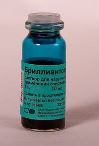 Бриллианты для диктатуры бизнеса А вот зеленку многие поборники современности готовы стереть с лица земли. Аргумент — нигде на Западе ее не применяют. Давайте разбираться. Во-первых, что в ней такого бриллиантового? Другие красители имеют названия поскромней. Есть малахитовый зеленый, есть метиленовый синий и фиолетовый. Есть желтый риванол и красный фуксин. И он один — бриллиантовый. В сухом виде, до растворения в спирте, это золотисто-зеленые комочки, по латыни viridis nitentis, то есть «зеленый блестящий». Переводя название на французский, неведомый химик использовал слово brillant — по-французски «блестящий». Ну а какой-то наш балбес, как безграмотные переводчики и сейчас, перевел как «бриллиантовый». И все. Почему зеленку не применяют за границей? Мы привыкли любую царапину, ссадину и порез обрабатывать зеленкой, особенно детям, которые в подобных случаях верещат от йода и боятся шипящей перекиси водорода. Но за границей, ни в одной аптеке зеленку мы не обнаружим. И удивляемся: