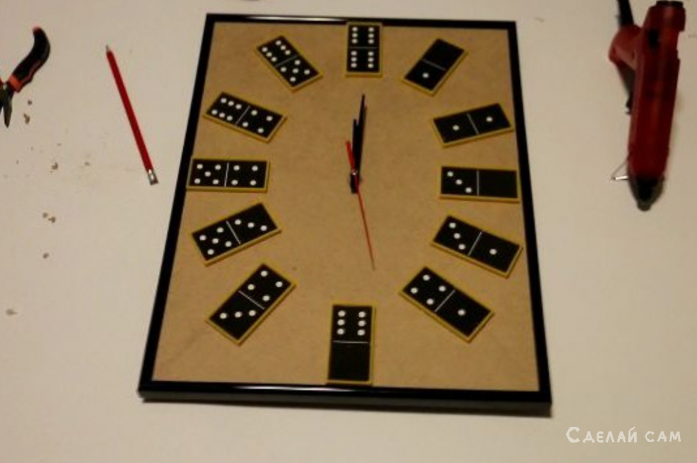Проще всего разметить места с помощью линейки или любой другой ровной плоскости. Размещаем элементы по своим местам. Фиксируем с помощью термоклея. Просверливаем отверстие по средине. Устанавливаем циферблат. Вот собственно и все. Часы готовы!