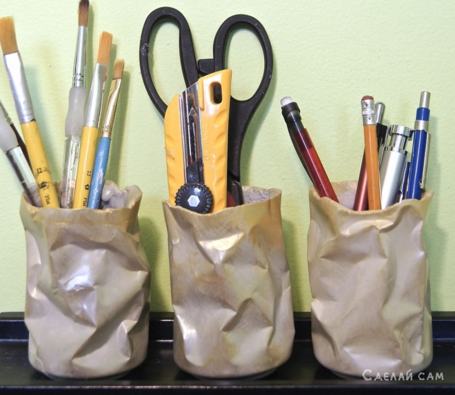 Срезаем у банки верхушку. Сделать это достаточно просто. Далее сминаем стенки таким образом что бы выглядело все максимально помятым. Далее самое интересное. С помощью быстросохнущей смеси (это может быть как гипс, так и любая другая смесь) формируем стенки будущей подставки. Вязкая смесь хорошо держится на стенках. Даем просохнуть, после чего, когда смесь застыла аккуратно, с помощью плоскогубцев снимаем стенки банки с подставки. Стачиваем неровности сверху получившегося стакана. Далее покрываем краской, на свой вкус. Мне больше нравиться золотой цвет. Им и покрасил.