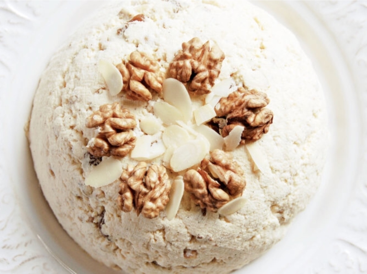 Нам понадобится: Молоко - 1 литр Сметана 18% - 250 мл Яйца - 3 шт Масло сливочное - 125 г Ванильный сахар - 1 пакетик Сахар - 60 г Изюм, курага, миндаль, грецкий орех, финики - по вкусу Начинаем готовить: Налейте молоко в кастрюлю, поставьте на огонь и вскипятите. Перемешайте яйца со сметаной и добавьте в кипящее молоко. Сделайте огонь медленным и постоянно помешивайте до тех пор, пока содержимое не разделится на сыр и сыворотку. Снимите кастрюлю с огня и оставьте охлаждаться. Положите в дуршлаг двойной слой марли и процедите массу. Лучше всего оставить дуршлаг на ночь или подвесить марлю над раковиной, чтобы жидкость хорошо стекла. Затем смешайте масло с сахаром и ванильным сахаром. Постепенно добавляйте сыр и перемешивайте, пока не получится однородная масса. Изюм и курагу залейте кипятком на 5 минут. Затем слейте воду. Курагу и орехи порежьте на мелкие кусочки. Добавьте изюм, курагу и орехи к массе и тщательно перемешайте. Оберните сыр в марлю и уберите в холодильник на несколько ч