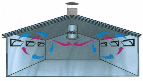 Вне зависимости от вида вентиляции, производительность системы должна быть ориентирована на количество особей в птичнике – на каждые 5 голов 1 м2 свободной территории.