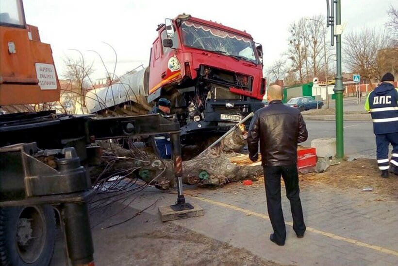 Рано утром 28 марта, когда многие жители Березы еще спали, я направлялся на работу на автомобиле. Впереди встретил мигающие красные маячки. Остановился, чтобы в темноте определить ситуацию на дороге. Это была военная организованная колонна. Добравшись до перекрестка Ленина-Комсомольская, остановился на светофоре (красный свет). Напомню, что было еще темно, а уличные фонари отключают очень рано. Вдалеке мне навстречу летела непонятная военная машина. Как потом оказалось, это был БТР. А в это время с ул. Комсомольская, которая имеет недалеко от светофора неудобный поворот, на зеленый свет ехал тяжелый молоковоз с прицепом. Если учесть, что начало колонны уехало по Ленина к центру, а конец остался далеко («Санта-кэш»), то понятно – водитель маза не мог видеть колонну. Тем более, что она имела большой разрыв между автомобилями. Столкновение было неизбежным. БТР протаранил грузовик в боковую часть кабины. Так молоковоз оказался на дереве. Водитель отделался переломом ноги, остальны