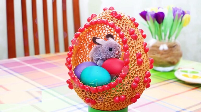 Декоративное пасхальное яйцо из макарон очень легко и достаточно просто можно сделать своими руками. Из обычных составляющих можно сделать такую красоту, что ни в сказке сказать, ни пером описать. Включите фантазию – и превратите обычную поделку в настоящий шедевр. Пасхальное яйцо, сделанное своими руками, станет прекрасным украшением интерьера. Вложите в него душу, любовь – и тогда вашей работой будут восхищаться не только близкие, но и все приходящие гости. Что нам понадобится: Пасхальное яйцо из макарон: подробный процесс создания Согласитесь, что такая своеобразная подставка под яйца не только пасхальный стол украсит, но и сделает ваш интерьер более уютным. Привлеките к созданию красоты детей: они в восторге от такой работы. На нашем сайте «Девчата» вы найдете и другие полезные статьи: и не только по рукоделию. Оставайтесь с нами и делитесь полученными знаниями с друзьями.