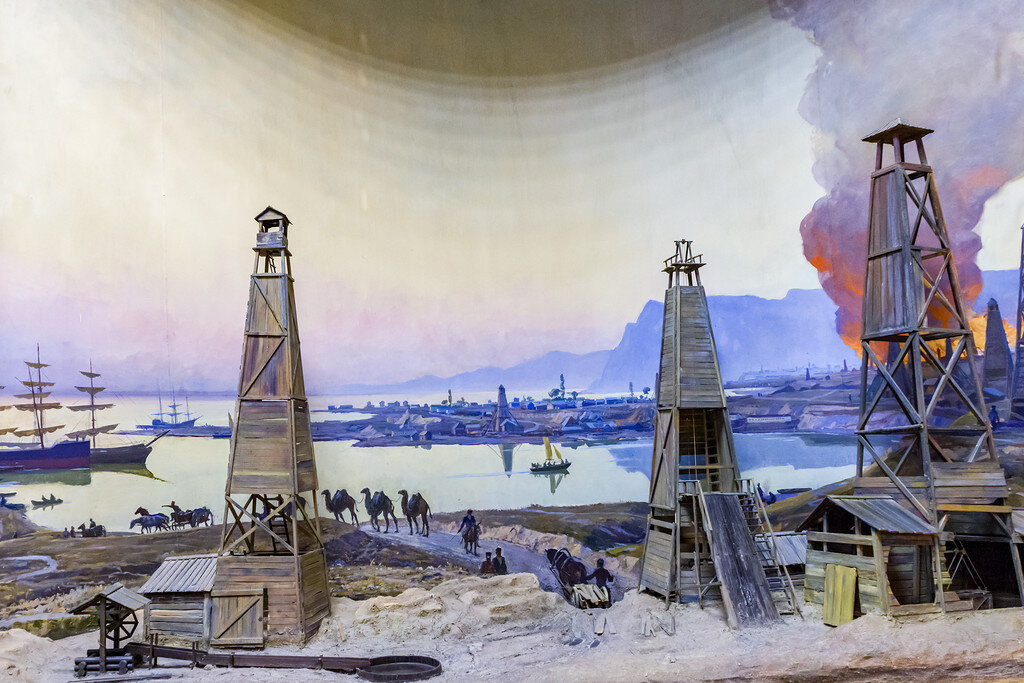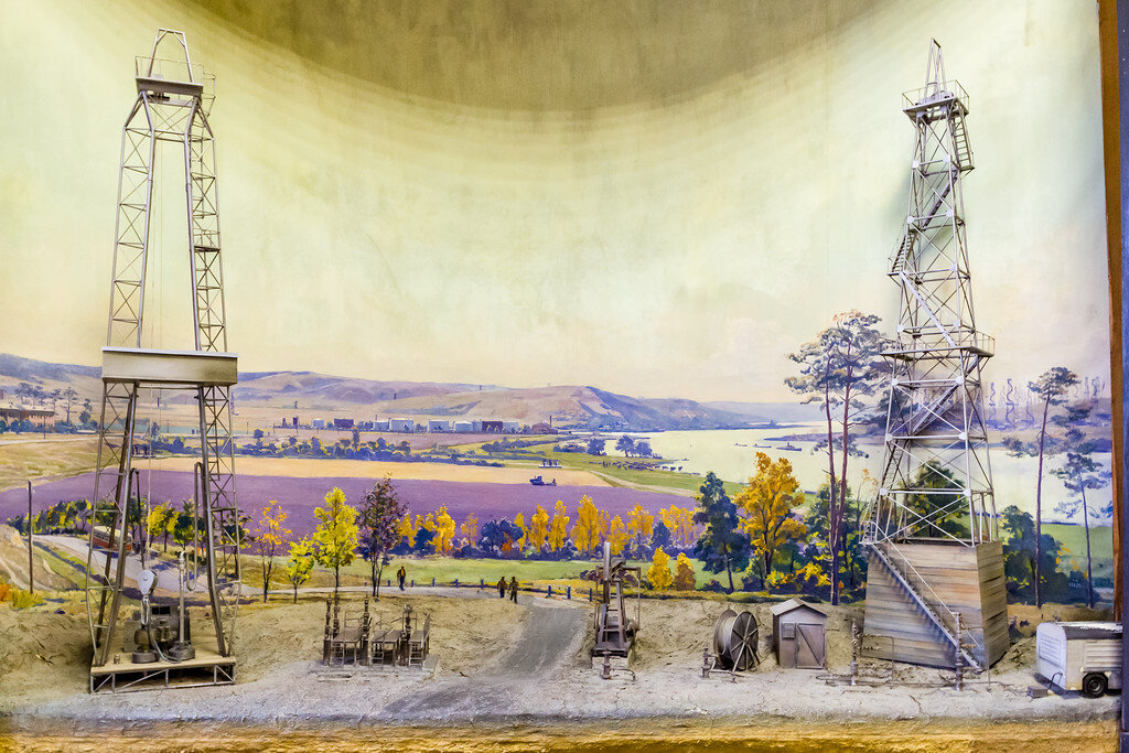 Из коллекции московского Политехнического музея Макет первых деревянных нефтекачек. На заднем плане - пожар на месторождении Советские ранние вышки нефтедобычи. Скважина. Насосы. Система трубопроводов. Макеты других вышек. Лебедка для подъема бура. Наконечники буров для скважин. Тело бура с вращающимися крыльчатками.