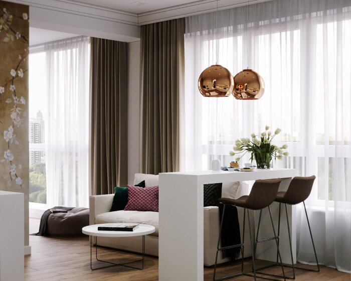 Кухня-гостиная является прекрасным решением для маленькой квартиры. Таким образом, можно добиться впечатления достаточно просторного помещения, сохраняя при этом полный набор функциональных качеств, как кухни, так и столовой с гостиной. Для создания этого дизайна интерьера были применены классические приемы визуального увеличения пространства. Использование белого цвета для отделки стен, потолка, мебели и фасадов кухонного гарнитура. Большие окна с белыми легкими занавесками тоже придают помещению легкости. В квартире два акцентных элемента сочетающихся между собой цветом. Это нежная стена с цветущей сакурой и очень интересные, яркие светильники над барной стойкой. Акценты разбавляют монохромность интерьера и делают его более живым. Уют в гостиной создает встроенный камин, живые цветы и приятный текстиль. Обратите внимание, что барная стойка, стулья и журнальный столик имеют очень тонкие ножки, это делает мебель легкой и воздушной. Для взгляда нет существенных препятствий - это позв
