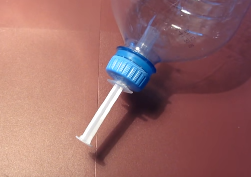 Для такой простой конструкции нам понадобится всего ли бутылка и шприц. Нужно просто проколоть дырку в крышке бутылки, чтобы туда можно было впихнуть шприц. Верхушку шприца обрезать. Это должно выглядит так как на фото. Вода льется, когда шприц полностью вдавлен в бутылку. Находится в закрытом состоянии, когда полностью вынут шприц. Такая конструкция легко выдержит два литра воды.