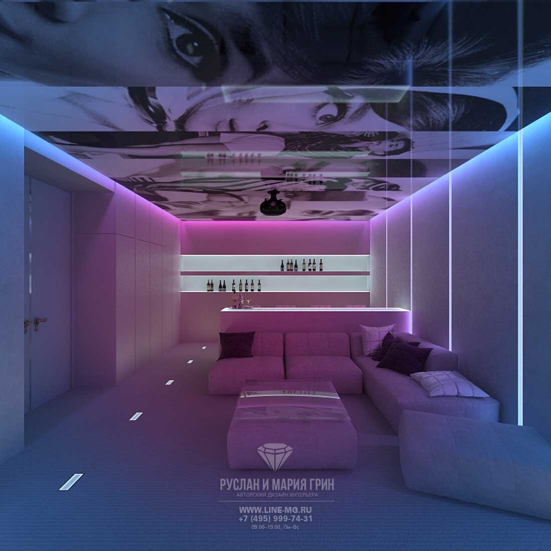 Домашний кинотеатр можно реализовать как дизайнерскую идею и в квартире, и в загородном доме. Такая комната будет настоящим символом ваших выходных, вы сможете наслаждаться ею в семейном формате или пригласить друзей! ЭКСКЛЮЗИВНЫЙ ПОДХОД К ПРОСМОТРУ КИНО Дизайнеры Руслан и Мария Грин знают, как важно хорошо отдохнуть после насыщенного рабочего дня. Домашний кинотеатр может сделать вашу жизнь совершенно иной – вы будете получать удовольствие от эксклюзивного просмотра любимых фильмов в собственном кинотеатре с профессиональной видео-аппаратурой и акустикой. Если вам уже не терпится заполучить проект домашнего кинотеатра для загородного дома (на цоколе, мансарде, на первом этаже), вы можете заказать дизайн-проект здесь. ПУТЕШЕСТВИЕ В БУДУЩЕЕ С ДИЗАЙНЕРСКИМ ИНТЕРЬЕРОМ В интерьере этой гостиной диванная зона для просмотра TV дополнена барной стойкой за ней, с местом для хранения напитков и смешивания коктейлей. Отделка представлена уникальной комбинацией оттенков и фактур авторской ра