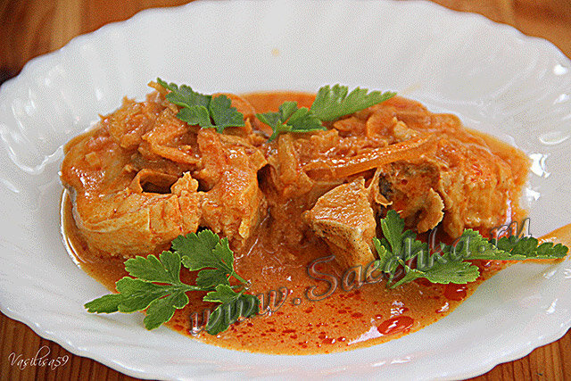 - Добавить ложку томатной пасты и ложку сметаны, разбавленной водой. Получившийся соус посолить, добавить чёрный перец (горошком) и лавровый лист.