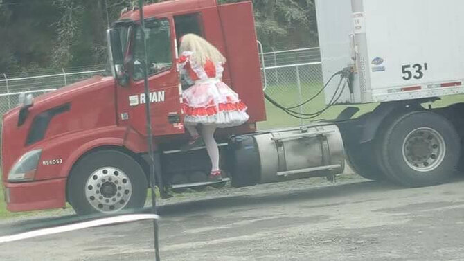 Эта фотография была опубликована в сообществе посвященном водителям грузовиков в Америке "Truck Drivers U.S.A." в социальной сети Фейсбук "Facebook". На фотографии был запечатлен очень необычный и интересный водитель грузовика, который ломает все известные стереотипы о водителей фур. К сожалению, фотография не сопровождается комментарием о том, где именно была сделана фотография, при каких обстоятельствах и вообще, какого пола водитель был запечатлен на фотографии. Но даже, если это и представительница слабого пола, ее наряд все-равно остается очень интересным и неожиданным. Естественно, снимок очень интересный, но далеко не факт, что это не постановка и не первоапрельская шутка. Не забывайте ставить палец вверх если Вам понравилась новость/статья, чтобы как можно больше любителей автомобильной тематики смогли с ней ознакомиться, и подписывайтесь на наш канал 4Wheels2U (4КолесаДляТебя). Ни гвоздя, ни жезла!