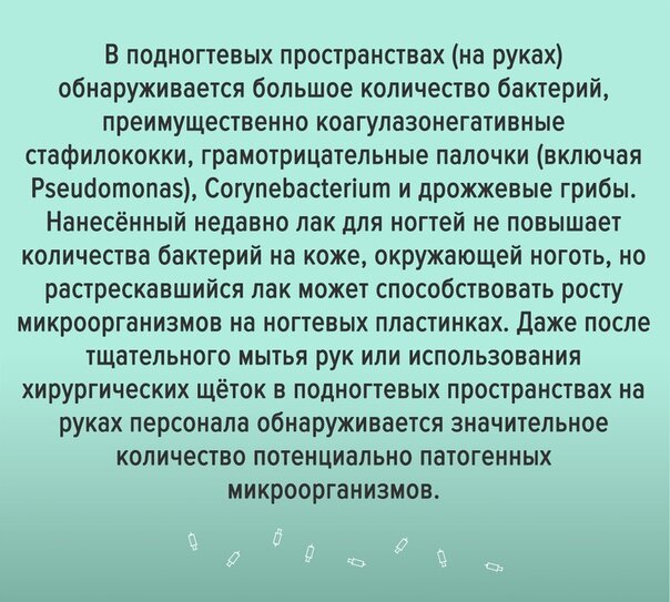 Старшие сестры обычно запрещают иметь длинные ногти, пользоваться лаком, а также носить кольца, однако это происходит не везде : А у нас на работе никто за такими вещами не смотрит. Сестры наращивают длиннющие ногти, красят такими цветами, что светятся как светофор и это в хирургическом отделении. Так можно ли на самом деле иметь длинные ногти, или это плавучее мнение отдельных руководителей? Опытные сестры рассказывают, что ещё во времена СССР сие действие было под запретом : В Справочнике операционной и перевязочной сестры за 1985 год написано, что покрывать ногти лаком категорически запрещено. И что не следует обрезать кожицу ногтевого валика, потому что между ногтем и валиком образуется щель, в которой легко скапливаются микробы